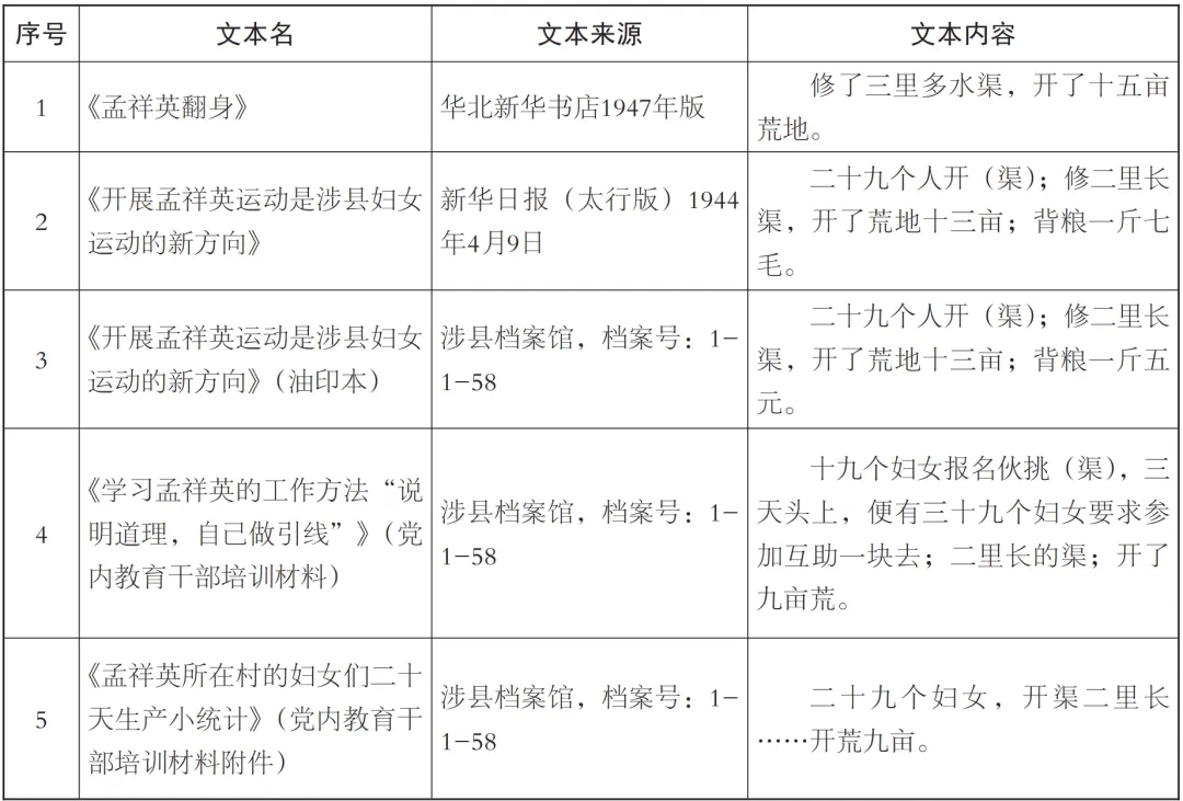 這份表格整理了涉及孟祥英與太倉村婦救主任之間交往的各類文本,包括文學作品、公開報道與政府文書,在文本生成時間序列上由近及遠,相互影響,在文本等級與流通范圍上由高到低、由廣到狹,在文本細節(jié)上,也表現(xiàn)出由略到詳?shù)奶攸c[35]。觀察表格,我們可以意識到:從數(shù)據(jù)上看,公開報道并不比文學作品來得精確,政府文書也并不比公開報道更權(quán)威。材料3是由涉縣建設(shè)科保存的報道油印件,剛好是公開報道材料2的“底本”,對比可知,公開報道對部分數(shù)據(jù)做了改動。材料5與材料4來源于同一份保存在涉縣檔案館的干部培訓材料,材料5作為材料4的附件出現(xiàn)。這意味著哪怕是兩份由相同筆跡抄寫、油印的材料,只因文件在形成時間與來源方面的差異,就提供了完全不同的數(shù)據(jù)。各類文本在數(shù)據(jù)層面的分歧清楚地向我們呈現(xiàn)出:在文本復(fù)制的過程中,數(shù)據(jù)往往并不穩(wěn)定,反倒是以婦救主任的轉(zhuǎn)變論證孟祥英工作方法之正確性的敘事模式得以毫無損耗地流傳下來。也就是說,與生產(chǎn)經(jīng)驗相比,敘事模式反而是更值得繼承的面向。