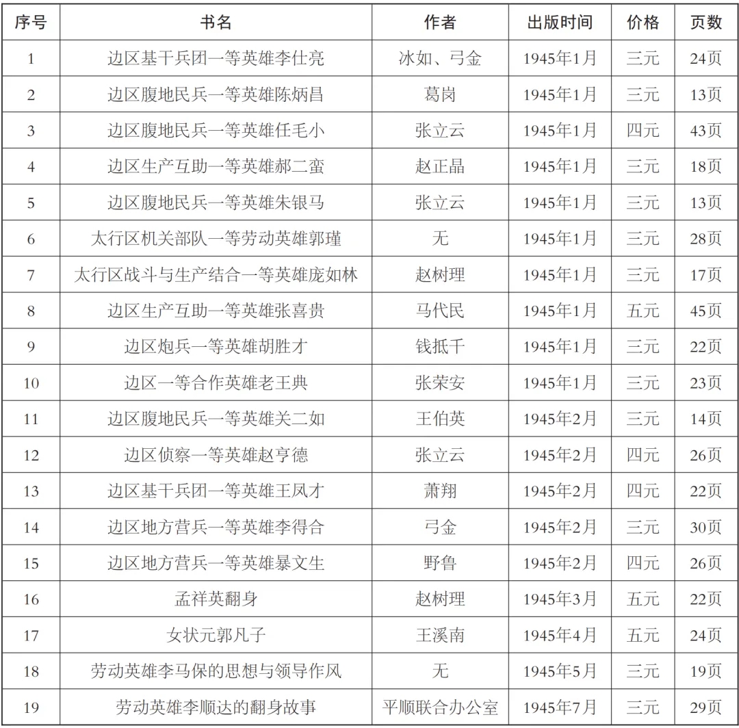 出版量從1944年的9萬冊驟然提高到1945年的45萬冊,依靠的正是這批“殺敵英雄、勞動英雄的故事以及由調(diào)查研究而寫出的文藝小冊(子)”。為了配合這一出版方面的轉(zhuǎn)向,太行區(qū)宣傳部還進行人員調(diào)整,將“書店與報社合并,文化事業(yè)委員會亦合并去報社,成為叢書編輯部”[45]。這里的“書店”就是指華北新華書店,“報社”即《新華日報》(太行版),這一合并形成的“叢書編輯部”,就是趙樹理的工作單位。此后,群眾/通俗讀物與干部讀物成為根據(jù)地出版工作的常用區(qū)分,1946年新成立的冀南書店就直接將編輯部分成干部讀物組和通俗讀物組,并規(guī)定“通俗讀物占全部出版物的三分之一”[46]——群眾讀物體系的建設(shè)無疑成為解放區(qū)出版工作的重要發(fā)展方向。