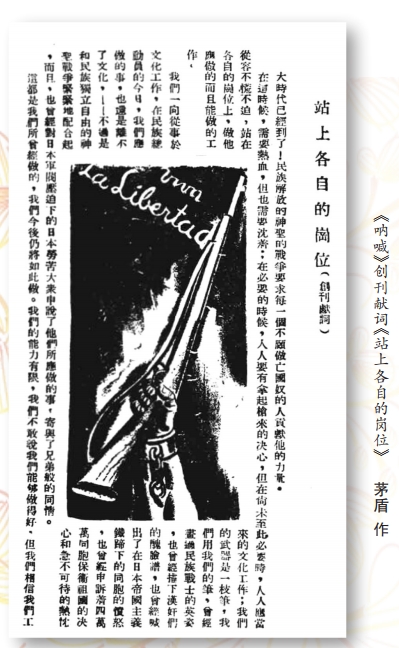 1937年8月22日,《吶喊》在茅盾、巴金等人的努力以及“四社”聯(lián)合的支持之下正式創(chuàng)刊,茅盾擔任主編,負責內(nèi)容策劃與文稿審定,巴金則出任發(fā)行人,主持出版工作與后勤事務。所謂“四社”,是指當時的四大知名文學社團,其中包括:鄭振鐸所主持的“文學社”,黎烈文領(lǐng)導的“中流社”,巴金與靳以共同負責的“文季社”,以及黃源主辦的“譯文社”。這四家文學類社團不僅在當時享有很高的聲望,還各自擁有多年的出版經(jīng)驗及穩(wěn)定的讀者群體。得益于“四社”的合作,《吶喊》在創(chuàng)刊之初就獲得了寶貴的作者資源、讀者市場及運作經(jīng)驗,也正是因為這樣的背景,《吶喊》這一新生的抗戰(zhàn)刊物在初創(chuàng)階段就擁有了較強的文化凝聚力與社會影響力。