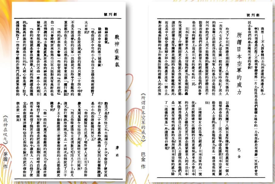 同樣不可忽視的是巴金在《烽火》出版過程中的關(guān)鍵作用。作為《吶喊》和《烽火》的聯(lián)合創(chuàng)刊人之一,巴金不僅全程參與了從《吶喊》到《烽火》的編輯出版工作,更是從《烽火》第六期開始接任了茅盾的主編任務。在戰(zhàn)火紛飛、出版條件極其困難的情況下,巴金始終堅持組稿和撰寫文章,甚至為了確保了刊物的持續(xù)出版,他隨身攜帶未刊稿件,輾轉(zhuǎn)于中國南方地區(qū)躲避戰(zhàn)爭并隨時尋找機會進行刊印。巴金的文學創(chuàng)作一直以直面現(xiàn)實、情感熾烈和附有批判性而著稱,在為刊物供稿的過程中,他將個人情感與民族命運緊密結(jié)合,用文字向社會傳達了人民的處境和心聲。1937年8月28日,日軍轟炸上海南站,造成大量平民傷亡,巴金憤慨萬分,提筆撰寫了《所謂日本空軍的威力》一文發(fā)表在《烽火》上,嚴詞譴責日軍:“這不是戰(zhàn)爭,這是謀殺!日本空軍展露給世界人士看的,并不是它的威力,而是一種虐他性的瘋狂!”他將日軍稱為“一群沒有理性的渴血生物”,以此來表達他作為中國人的憤怒和作為一名作家的良知。據(jù)重慶師范大學統(tǒng)計,巴金先后在《吶喊》與《烽火》上發(fā)表各類作品30余篇,體裁涵蓋雜文、小說、詩歌與譯作,是《吶喊》和《烽火》供稿最多、影響最大的核心作者之一。