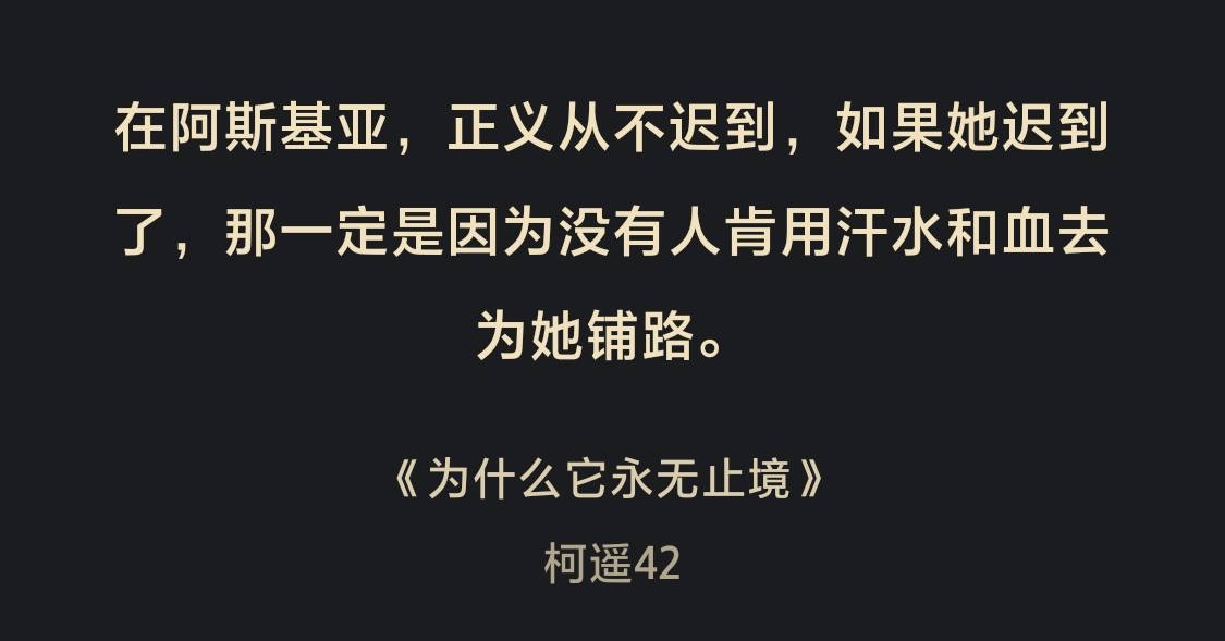 虞婧:除了女性價(jià)值和力量的展現(xiàn),我能感覺(jué)到作品對(duì)世界的公平正義、社會(huì)結(jié)構(gòu)和運(yùn)行邏輯也在做一些探討。比如提到“在阿斯基亞,正義從不遲到,如果她遲到了,那一定是因?yàn)闆](méi)有人肯用汗水和血去為她鋪路”,比如麗茲提出“認(rèn)為陷入他人的騷擾是因?yàn)樽约哼€沒(méi)有力量”的邏輯是不對(duì)的,比如文中說(shuō)到“憤怒”是很重要的。作品中也會(huì)提到一些關(guān)于哲學(xué)、社會(huì)學(xué)的書(shū)籍。