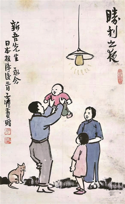 1945年8月10日,當電臺里傳來日本接受《波茨坦公告》全面無條件投降的消息時,重慶的大街小巷人們奔走相告,慶祝勝利的鞭炮聲此起彼伏。當時避居山城的豐子愷,有感于此,繪制了《卅四年八月十日之夜》——父親喜不自禁,將孩子高高舉過頭頂,象征光明和勝利的燈光照亮畫面。豐子愷通過一個家庭的溫暖瞬間,描繪了抗戰(zhàn)勝利之夜的人民心聲。隨之,豐子愷在此基礎(chǔ)上再繪《勝利之夜》,畫面中的紫衣男孩換作笑容溫婉的母親。9月2日,日本代表在美軍“密蘇里”號軍艦簽署無條件投降書,豐子愷即作《炮彈作花瓶 萬世樂太平》——桌面上的炮彈殼成為花瓶,寓意和平的荷花插入其中,兩個兒童玩具倚放其旁,展現(xiàn)了他對世界和平的美好祈愿。