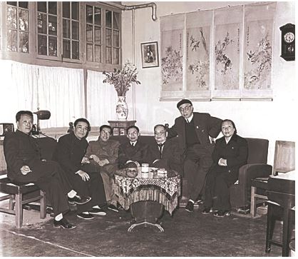 1960年,戲劇家們?cè)诒本堊灾衣窔W陽(yáng)予倩家中,左起:陳白塵、陽(yáng)翰笙、張庚、夏衍、歐陽(yáng)予倩、田漢、李伯釗