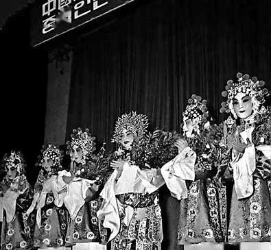 梅蘭芳(中)、馬連良(后排左)、程硯 秋(后 排右)在朝鮮慰問演出。