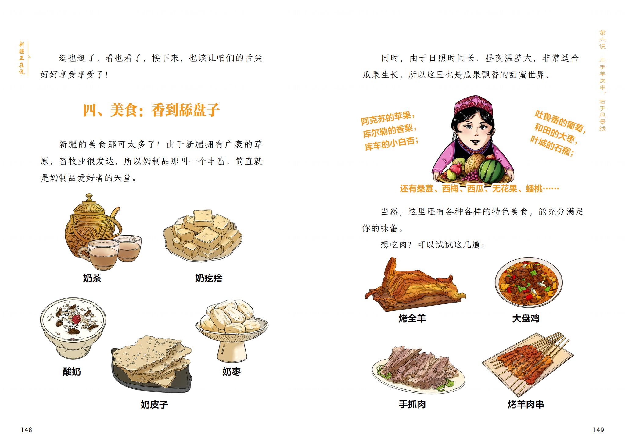 據(jù)圖書(shū)的項(xiàng)目負(fù)責(zé)人介紹,《新疆正在說(shuō)》用富有趣味性、故事性、知識(shí)性的漫畫(huà),帶領(lǐng)小讀者踏上一場(chǎng)奇妙的新疆之旅。在這片占全國(guó)陸地面積六分之一的廣袤大地上,既有雪山與草原的壯美,也有大漠和戈壁的蒼涼。雪白的棉田、碧綠的麥田和果園展開(kāi)幸福生活的畫(huà)卷,熱騰騰的烤羊肉串、香甜的哈密瓜等美食滿足舌尖的渴望。翻開(kāi)這本書(shū),孩子可以走進(jìn)一個(gè)多元、立體、充滿魅力的新疆。