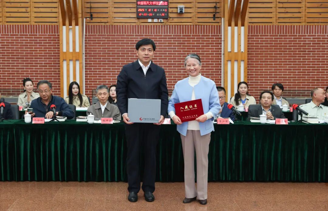 鄭蘇伊代表臧克家親屬向中國(guó)現(xiàn)代文學(xué)館捐贈(zèng)了1000余件手稿、實(shí)物,368本名家簽名贈(zèng)書(shū)等珍貴文獻(xiàn)。中國(guó)現(xiàn)代文學(xué)館常務(wù)副館長(zhǎng)王軍接受捐贈(zèng),并頒發(fā)入藏證書(shū)