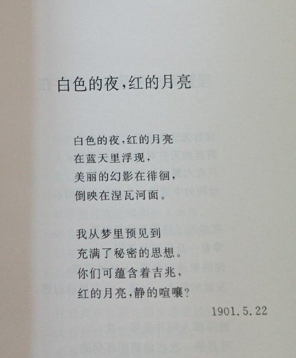 白色的夜,紅的月亮/在藍(lán)天里浮現(xiàn),/美麗的幻影在徘徊,/倒映在涅瓦河面。/我從夢(mèng)里預(yù)見到/充滿了秘密的思想。/你們可蘊(yùn)含著吉兆,/紅的月亮,靜的喧嚷?(《勃洛克抒情詩(shī)選》,汪劍釗 譯)