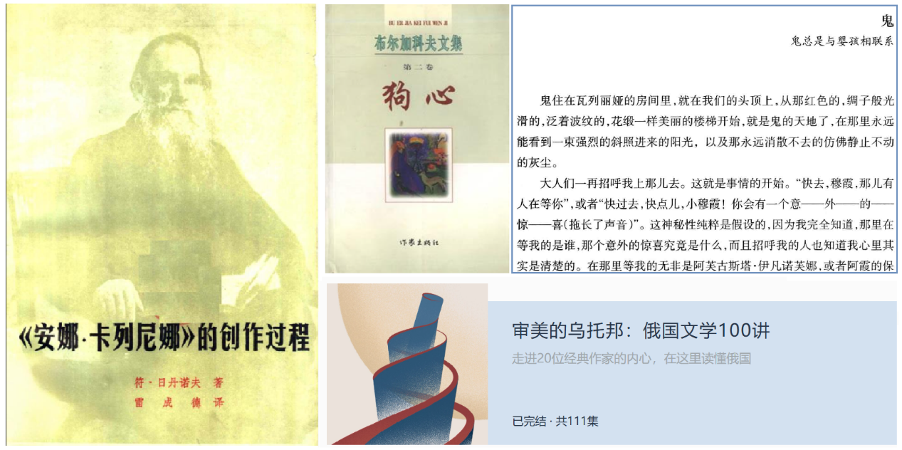 阿舍(作家,著有《托爾斯泰的胡子》《阿娜河畔》等):讀俄國(guó)和蘇聯(lián)文學(xué),我常有一種吃不消的感覺,好比一個(gè)脾胃虛弱的人承受不住補(bǔ)品里的滋補(bǔ),非要溫和少量地循序而進(jìn),方得養(yǎng)分之益。所以,相比其他國(guó)家,俄蘇作品雖讀得稍多,卻從來不敢對(duì)之妄言,因?yàn)榧幢闶亲x過的作品,至今仍只是從自己敏感、共情的那一個(gè)方面析出一小部分,如同從一片森林里撿出一枚樹葉,常有難以穿越的絕望感。不過,在明白憑一己之力難以深入這片森林之后,我也幸運(yùn)地不斷遇到能夠帶我繼續(xù)向前的“好向?qū)А?,這大概就是書籍與人的緣分。比如,在重讀《安娜》后,我從朋友那里得到了《〈安娜·卡列尼娜〉的創(chuàng)作過程》這本書,從而領(lǐng)悟到這部作品在結(jié)構(gòu)上的建筑美學(xué)。比如,讀完《靜靜的頓河》之后,正好劉文飛老師在“看理想”開了《俄羅斯文學(xué)一百講》的音頻課,聽完肖霍洛夫這一講,我得以看出《戰(zhàn)爭(zhēng)與和平》《靜靜的頓河》二者之間的傳承關(guān)系,又在后者當(dāng)中擷取到超越前者的指引——樸素日常里的力量與深情。還有茨維塔耶娃的散文,她竟以《鬼》為題,確鑿可信地寫出了一位女性的精神成長(zhǎng)之路,這對(duì)以“寫實(shí)”為己任和評(píng)判標(biāo)準(zhǔn)的當(dāng)下散文可謂莫大挑釁。布爾加科夫在1925年寫出《狗心》,對(duì)比當(dāng)下讓人眼花繚亂的科幻作品,《狗心》的精神指向依然超前。精神與情感世界的澎湃洶涌,是老派的俄蘇文學(xué)給予我的“關(guān)鍵所在”,我仰望并需要,又因?yàn)槲窇炙墓饷⒉粫r(shí)躲開。