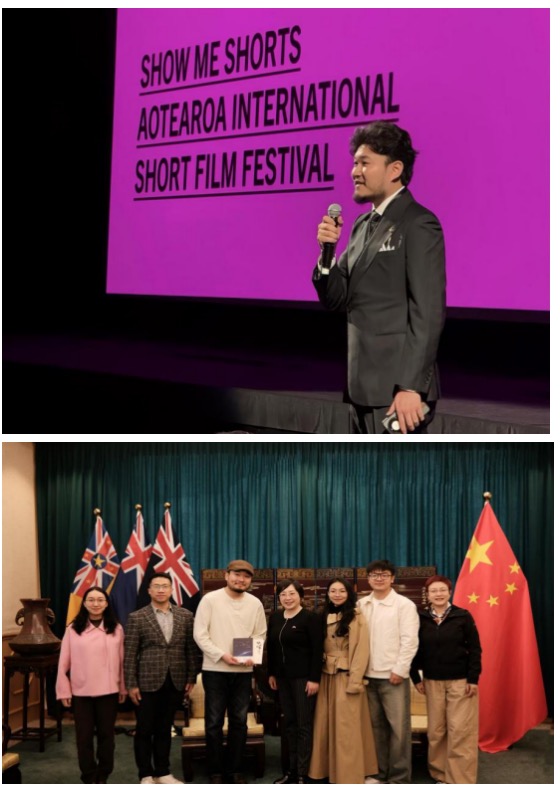 10月7日,在第20屆新西蘭秀美國(guó)際短片電影節(jié)上,中國(guó)首次擔(dān)任榮譽(yù)主賓國(guó)?!掇D(zhuǎn)人工》作為開(kāi)幕夜首映電影在奧克蘭一座有著140多年歷史的古典劇場(chǎng)The Civic正式放映。來(lái)自不同國(guó)家的700多位觀眾匯聚一堂,在不斷的歡笑聲中欣賞了這部充滿文學(xué)意味的“有趣的電影”。奧克蘭中國(guó)文化中心負(fù)責(zé)人王建文在致辭中表示:“短片藝術(shù)是影像語(yǔ)言中最具張力與實(shí)驗(yàn)精神的形式。希望通過(guò)這樣的國(guó)際平臺(tái),讓世界更好地了解當(dāng)代中國(guó)青年人的思考與表達(dá),也促進(jìn)中新兩國(guó)的文化互鑒與情感共鳴?!痹谟澈蠼涣髦?,不斷有熱心觀眾圍著劉漢霖,表達(dá)對(duì)這部電影反映的社會(huì)問(wèn)題的認(rèn)同感,期待讀到更多他的文學(xué)作品。