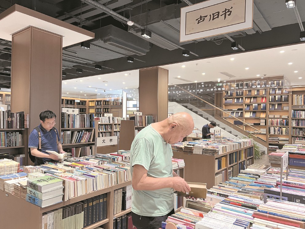 書店三樓既有按經(jīng)、史、子、集分類陳列舊版線裝書的“博古齋”,又有匯集舊書的“淘書樂園”,還有定期開張的屋頂舊書市集。《威尼斯商人》《巴黎圣母院》《百年孤獨》……大量外國文學作品,吸引了陸先生駐足。他說,在書店翻實體書、淘舊書和線上看電子書的感覺是不一樣的,“更有開盲盒的驚喜感”。上海圖書公司副總經(jīng)理程犁告訴記者,舊書市集除了購買圖書,還結(jié)合講座、展覽、工作坊等多種形式,增加市集互動性和教育性,不斷下沉至全市各街鎮(zhèn)社區(qū),精準對標愛書人文化需求,將書送到“最需要的讀者身邊,市民的家門口”。