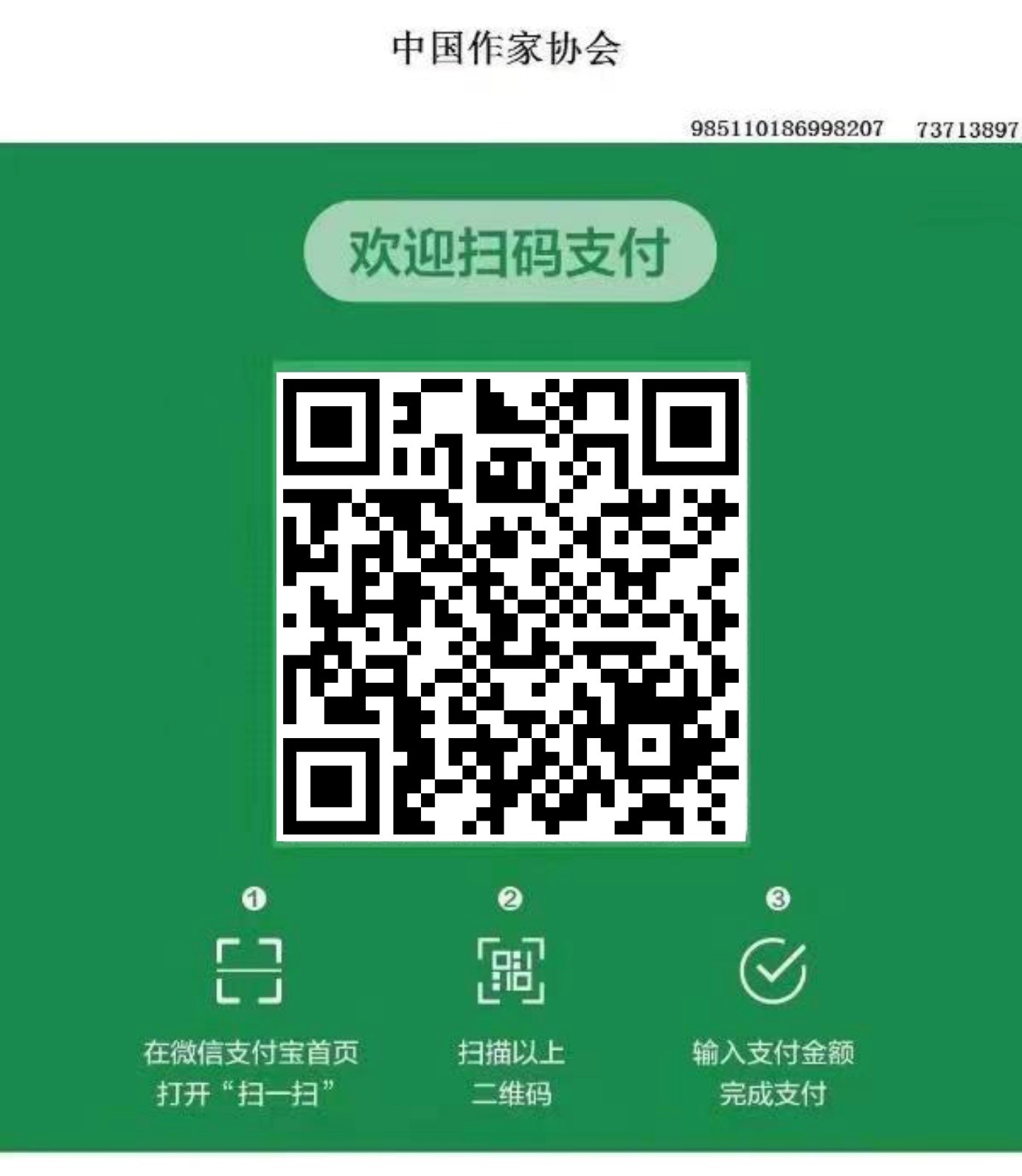 請(qǐng)掃描下方二維碼,通過(guò)微信或支付寶將會(huì)費(fèi)直接轉(zhuǎn)入中國(guó)作家協(xié)會(huì)銀行賬戶。