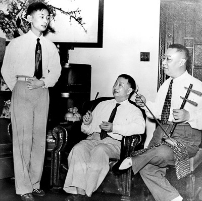 梅蘭芳在北京護國寺寓所指導(dǎo)梅葆玖吊嗓,王少卿操琴