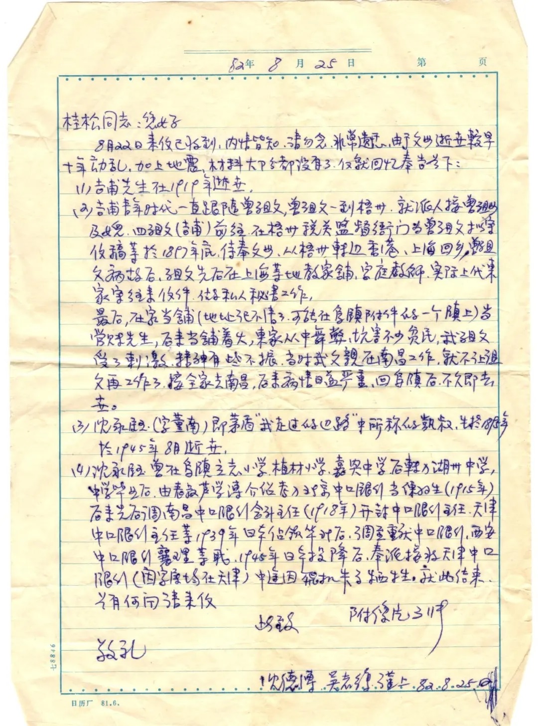 但是,比較遺憾的是,我在二十世紀(jì)八十年代與沈德溥、吳志復(fù)老師通信聯(lián)系多年,他們也給過我不少信,卻因?yàn)楫?dāng)年我沒有見到茅盾給阿英先生的這些信,請教起來常常不得要領(lǐng),只是一些日常的問候,只知道吳志復(fù)后來是從事會(huì)計(jì)財(cái)務(wù)工作,沈德溥先生是從事經(jīng)濟(jì)工作?,F(xiàn)在看到了茅盾致阿英先生的信,而沈德溥、吳志復(fù)這兩位茅盾的堂弟、堂弟媳已經(jīng)離開我們多年,再也無法了解當(dāng)年更多的細(xì)節(jié)了。不過,僅僅從這茅盾的兩封信,也可以看到其可貴的人格魅力。他不忘為國家銀行事業(yè)獻(xiàn)身的凱叔,為其后人的就業(yè)操心,這看似是私事,其實(shí)是讓因公犧牲的銀行家凱叔在天之靈得到安慰的公事。