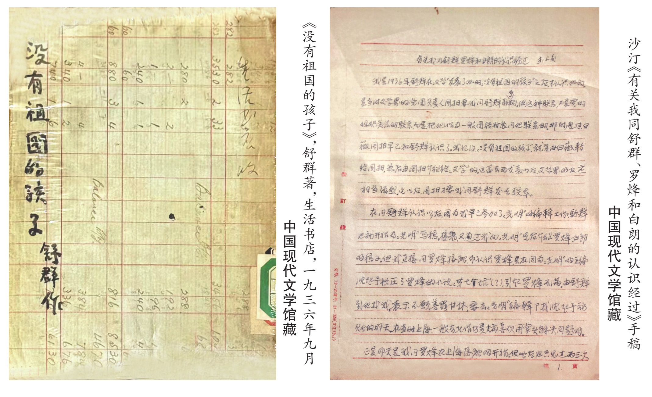 “我是1936年,舒群在《文學(xué)》發(fā)表了他的《沒(méi)有祖國(guó)的孩子》認(rèn)識(shí)他的……那時(shí),通過(guò)白薇,周揚(yáng)早已和舒群認(rèn)識(shí)了,我記得《沒(méi)有祖國(guó)的孩子》就是由白薇轉(zhuǎn)給周揚(yáng),然后由周揚(yáng)介紹給《文學(xué)》的。這篇東西發(fā)表以后,文學(xué)界反映相當(dāng)強(qiáng)烈?!痹谥袊?guó)現(xiàn)代文學(xué)館“山河跡憶——手稿里的抗戰(zhàn)中國(guó)”展覽中,展出了作家沙汀的手稿,真實(shí)地記錄了舒群和筆下的果里走上文壇的過(guò)程。