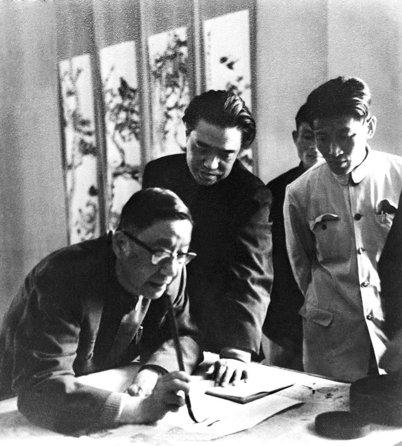 1962年4月,老舍在廣東參加潮劇座談會后為潮劇題詞。左二為陽翰笙、右一為潮劇作曲家馬飛。