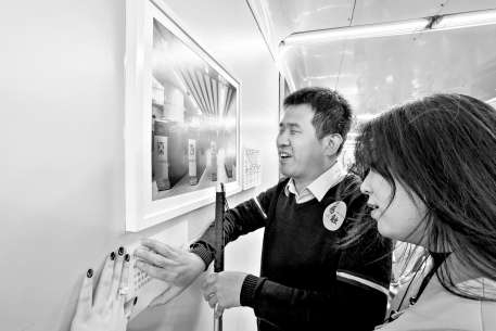 與普通展覽不同的是,這些作品旁還貼心地配備了盲文介紹,通過特殊的熱升華打印等技術(shù),攝影作品被制成了可觸摸的黑白浮雕圖片,視障乘客可以通過觸摸畫面凸起的輪廓,與普通乘客一樣,“看見”藝術(shù)的細(xì)節(jié)與情感。