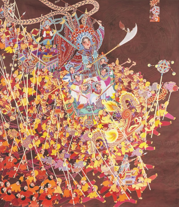 近幾年,在各級政府和相關(guān)部門的支持和引導(dǎo)下,三江農(nóng)民畫呈現(xiàn)出新的發(fā)展態(tài)勢。從創(chuàng)作內(nèi)容上看,畫家們積極表現(xiàn)新時(shí)代的新生活,以高鐵進(jìn)縣、鄉(xiāng)村振興等為主題的作品明顯增多。為了更全面展現(xiàn)家鄉(xiāng)的變化,三江農(nóng)民畫家們還集體創(chuàng)作長卷畫。比如《驚奇柳州》(長16米,高0.8米),以柳州的“一臺車、一江水、一朵花、一碗粉、一宗師、一歌仙”為主題,將柳州的五菱汽車、柳江、紫荊花、螺螄粉、柳宗元、劉三姐等具有地方特色的意象呈現(xiàn)出來,使三江農(nóng)民畫的題材在現(xiàn)代語境中變得更加豐富。