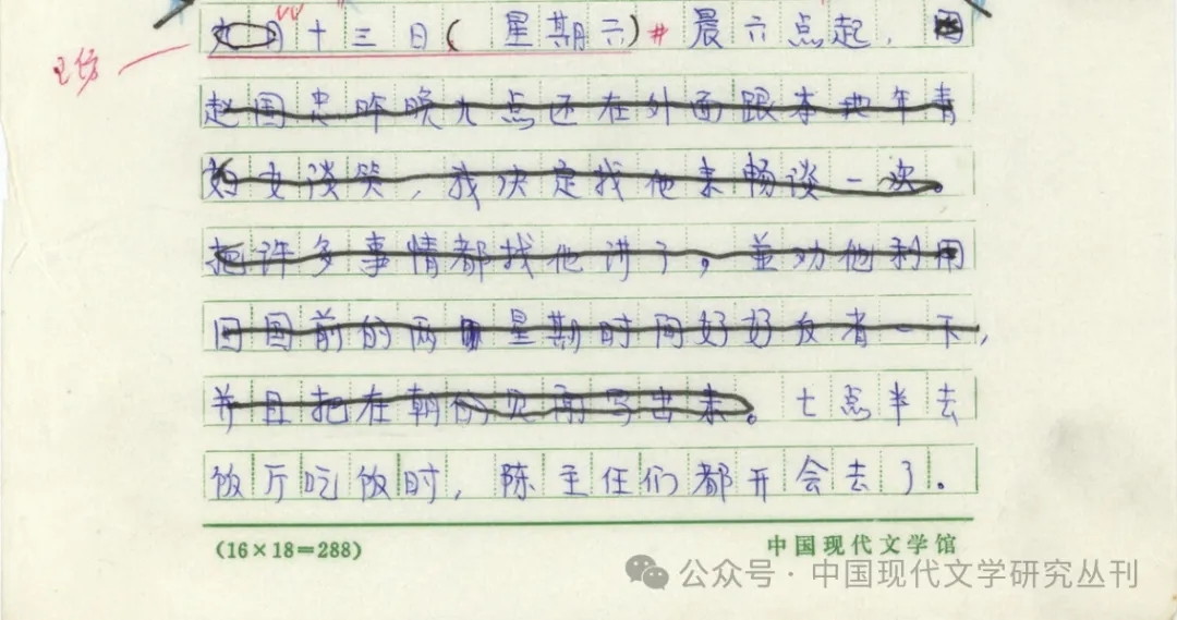 (2)1952年9月13日手稿為:“晨六點(diǎn)起,因趙國(guó)忠昨晚九點(diǎn)還在外面跟本地青年婦女談笑,我決定找他來(lái)暢談一次。把許多事情都對(duì)他講了,并勸他利用回國(guó)前的兩星期時(shí)間好好反省一下,并且把在朝的見(jiàn)聞寫(xiě)出來(lái)?!背灞驹谛8闹袆h去句中有關(guān)趙國(guó)忠的內(nèi)容,僅余“晨六點(diǎn)起”一句。