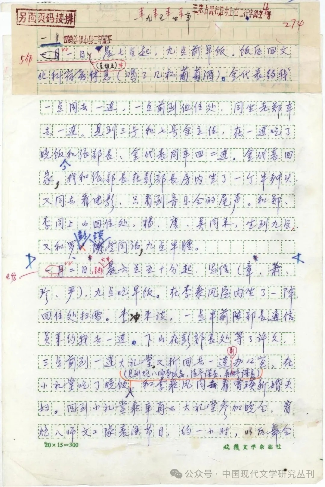 (二)抄件/抄稿本。抄稿本系方便日記文稿的編輯排版,巴金安排助手根據(jù)日記手稿原文抄錄所成,使用方格文稿紙單面抄寫(xiě),上有大量編校字跡和排版信息,并附頁(yè)碼和注釋文字。《赴朝日記》(一),封面1頁(yè),正文共196頁(yè)。根據(jù)抄錄的筆跡來(lái)看,應(yīng)有兩人參與了抄錄工作,根據(jù)抄稿右上角機(jī)印頁(yè)碼,5~70頁(yè)和132~200頁(yè)為同一人用藍(lán)色圓珠筆抄錄,正文71~131頁(yè)為另一人用藍(lán)黑色鋼筆抄錄?!陡俺沼洝罚ǘ饷?頁(yè),正文共78頁(yè)。根據(jù)筆跡來(lái)看,也有兩人參與抄錄工作,根據(jù)抄稿右上角機(jī)印頁(yè)碼,202~218頁(yè)由一人用藍(lán)色和黑色圓珠筆抄錄,219~279頁(yè)為另一人用藍(lán)色圓珠筆抄錄。根據(jù)抄稿本的筆跡推斷,應(yīng)有多人(至少三人)參與了《赴朝日記》手稿的抄錄工作。