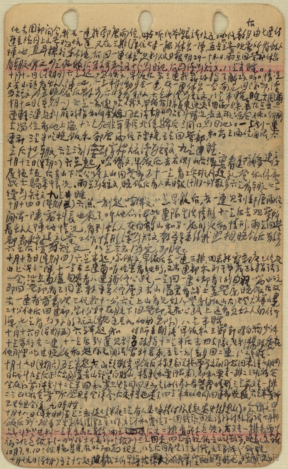 十月三日 星期五[96]晨六點(diǎn)起。念俄文,八點(diǎn)通訊員來(lái)通知去飯廳早飯。飯后在主任屋子前面平臺(tái)上曬太陽(yáng),敵機(jī)一架低飛散發(fā)傳單,正落在這個(gè)溝里。敵人進(jìn)行的中秋宣傳攻勢(shì)不過(guò)如此,傳單上有母親思念兒子的圖畫(huà)和中秋拜月的畫(huà),文字寫(xiě)得不佳,頭一句是“八月中秋月光明”。十點(diǎn)回宿舍看書(shū),午睡約半小時(shí),下午正坐在屋子前面念朝文,聽(tīng)水聲,看山下風(fēng)景。路坎同志來(lái)通知,要我搬到余科長(zhǎng)屋子里去,等到趙國(guó)忠打好鋪蓋卷,路科長(zhǎng)幫我拿提包,搬到了下面余科長(zhǎng)的屋子里面,在那里閑談了一陣,路科長(zhǎng)去后,余科長(zhǎng)拿來(lái)兩份《人民日?qǐng)?bào)》(27、28),剛看完,就聽(tīng)見(jiàn)號(hào)聲,便到飯廳去,人民軍金代表也來(lái)了,晚飯時(shí)喝了六杯葡萄酒,小半杯白蘭地,略有醉意。飯后和金代表、陳主任同去聯(lián)絡(luò)部坐了一陣,到晚會(huì)會(huì)場(chǎng)坐了一個(gè)多鐘頭,后來(lái)支持不住,就和陳主任、余科長(zhǎng)走出來(lái),回到住處,吐了兩口,喝兩三口茶,洗了臉即睡,時(shí)間不過(guò)七點(diǎn)半。