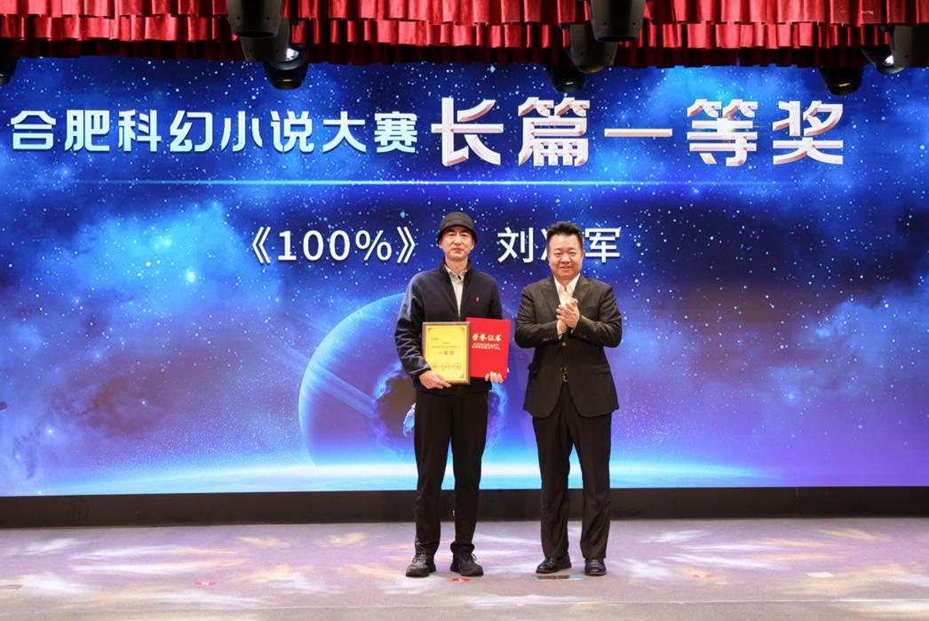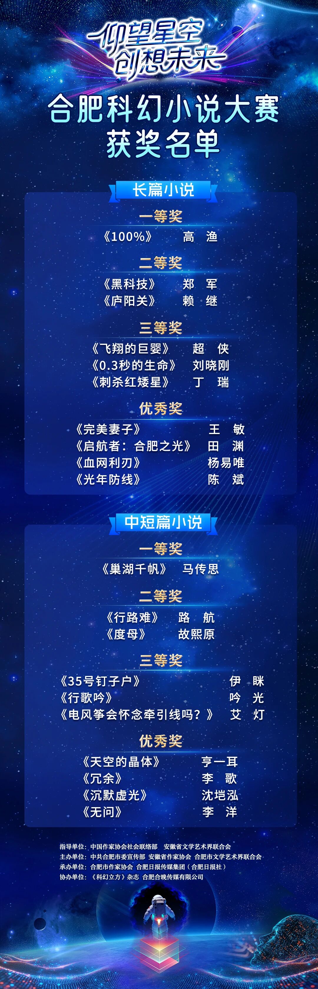 本次合肥科幻小說大賽以“仰望星空 創(chuàng)想未來”為主題,經(jīng)過近半年時(shí)間征集,收到投稿作品1349部,共8000余萬字,無論是參賽人數(shù),作品質(zhì)量,參選范圍,都遠(yuǎn)超預(yù)期,內(nèi)容涉及到星際探索、時(shí)空穿越、科技倫理、未來社會等多個(gè)科幻維度,通過層層篩選,嚴(yán)格評審,最終20部佳作脫穎而出。其中劉涼軍(高漁)的《100%》榮獲長篇小說一等獎;鄭軍《黑科技》、賴?yán)^《廬陽關(guān)》榮獲長篇小說二等獎;超俠《飛翔的巨嬰》、劉曉剛《0.3秒的生命》、丁瑞《刺殺紅矮星》榮獲長篇小說三等獎;王敏《完美妻子》、田淵《啟航者:合肥之光》、楊易唯《血網(wǎng)利刃》、陳斌《光年防線》獲長篇小說優(yōu)秀獎;馬傳思《巢湖千帆》榮獲中短篇小說一等獎,路航《行路難》、故熙原《度母》獲中短篇小說二等獎;伊瞇《35號釘子戶》、吟光《行歌吟》、艾燈《電風(fēng)箏會懷念牽引線嗎?》獲中短篇小說三等獎;亨一耳《天空的晶體》、李歌《冗余》、沈塏泓《沉默虛光》、李洋《無問》獲中短篇小說優(yōu)秀獎。