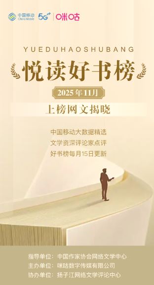 11月15日,由中國作家協(xié)會網(wǎng)絡文學中心指導,咪咕數(shù)字傳媒有限公司主辦、揚子江網(wǎng)絡文學評論中心協(xié)辦的“悅讀好書榜”第十一期榜單正式揭曉。