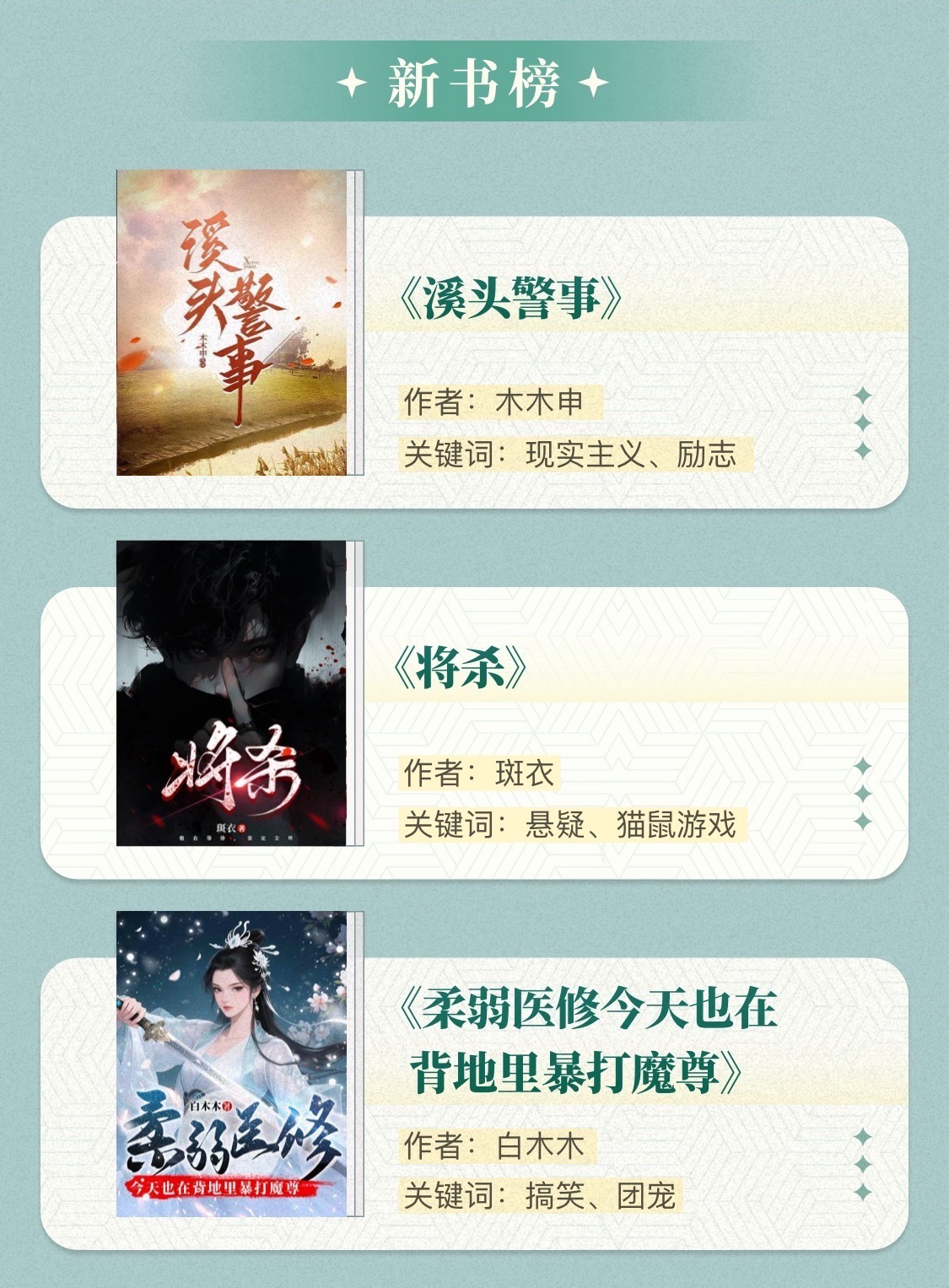 在新書榜中,三部新作在類型文的基礎上展開了新的突破?,F(xiàn)實主義題材作品《溪頭警事》扎根當下基層現(xiàn)實,通過數(shù)字化改革的生動實踐讓網(wǎng)絡文學成為記錄時代變革的載體,展現(xiàn)出網(wǎng)絡文學參與主流價值構建的積極姿態(tài)。懸疑作品《將殺》在劇情爽感之外,深層次聚焦家暴、創(chuàng)傷與人性困局,使作品具備兼具類型吸引力與現(xiàn)實關懷的思想深度。女頻玄幻作品《柔弱醫(yī)修今天也在背地里暴打魔尊》則通過對人物的反套路設定與幽默的敘事風格,在遵循修仙類型規(guī)則的基礎上完成創(chuàng)意重塑,為修仙類型寫作提供了可借鑒的范式。