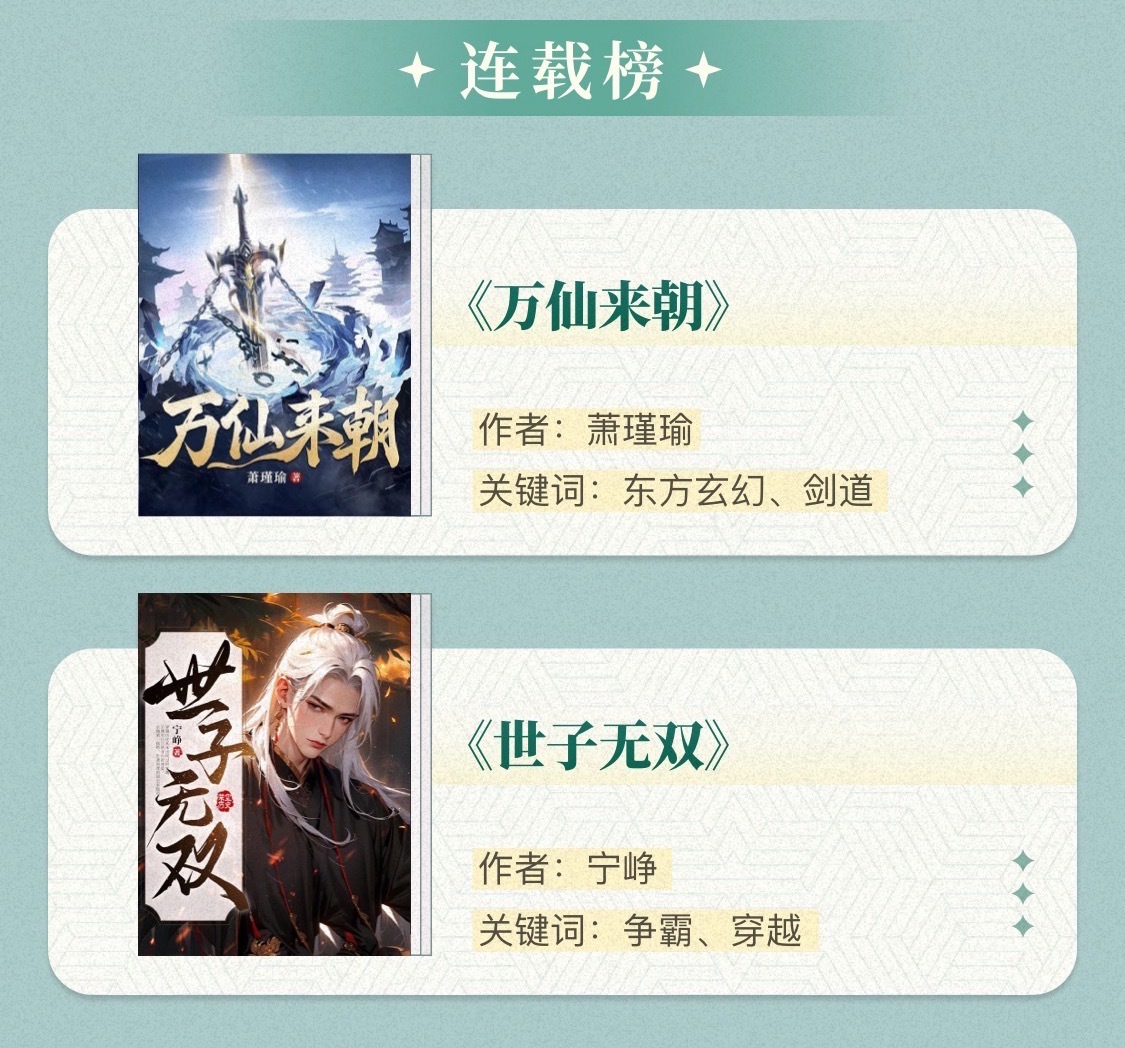 兩部入選連載榜的作品中,都在多線的敘事結構下,將主角人物線與成長線刻畫得更加飽滿。東方玄幻作品《萬仙來朝》以“諸天為囚籠,萬仙皆獄卒”為核心設定,搭建出格局開闊的仙俠世界。大量配角各具性格與命運,卻故事線彼此牽連,形成完整的因果網(wǎng)絡,共筑“守望相助”的仙俠世界觀。穿越題材作品《世子無雙》將穿越設定與權謀結構緊密結合,以現(xiàn)代視角重構古代權力博弈的解題路徑,人物內核塑造清晰堅韌。
