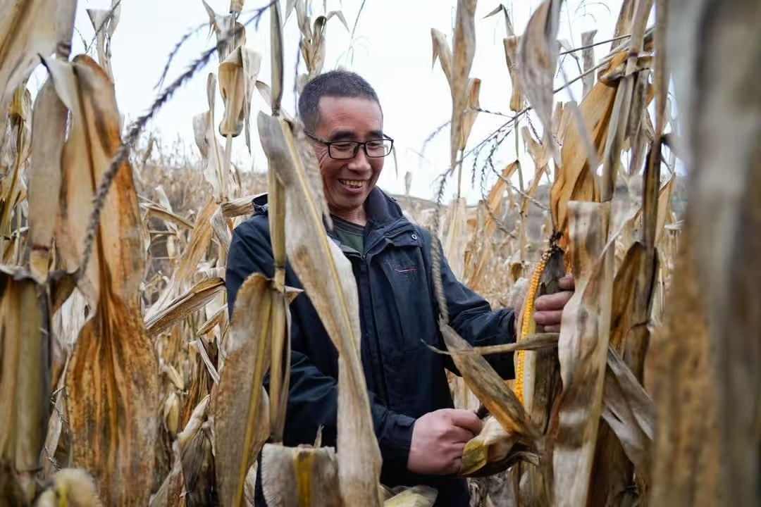 “家里就我一個勞動力,收得慢,得等大型收割機來?!辈鼙贿呎f一邊“唰唰”剝開包裹玉米的干葉,“啪”地一聲掰下玉米,“砰”地扔進玉米堆里。