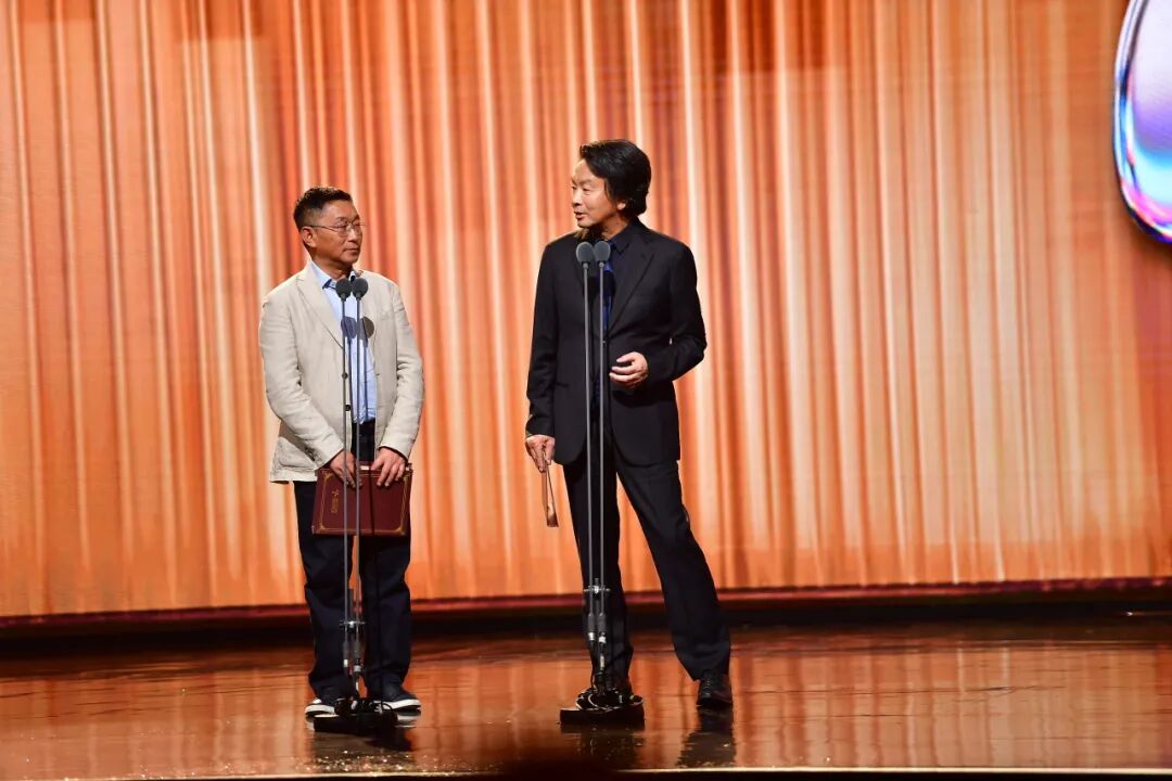 劉紅兵(右一)、何向陽(左一)為科幻文學獎、詩歌獎獲獎作家頒獎