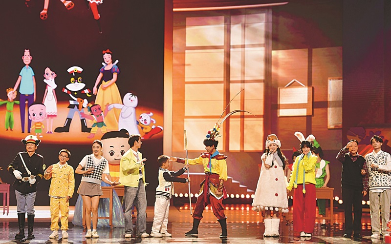 兒童文學(xué)以圖畫、書本、聲音、影像等不同形式進(jìn)入我們的生活,很多兒童文學(xué)作品也被改編成動畫片,成為一代代中國人的童年記憶。創(chuàng)意音樂秀《陪我長大的朋友》中,李維嘉、吳昕、鄭方一等十幾位嘉賓扮演成黑貓警長、哪吒、孫悟空、小王子、雪孩子、白雪公主、灰姑娘、葫蘆兄弟、小紅帽等動畫形象,從書型舞臺布景中“穿越”而來,帶領(lǐng)觀眾重溫童年的無憂無慮,呵護(hù)心底的天真幻想。