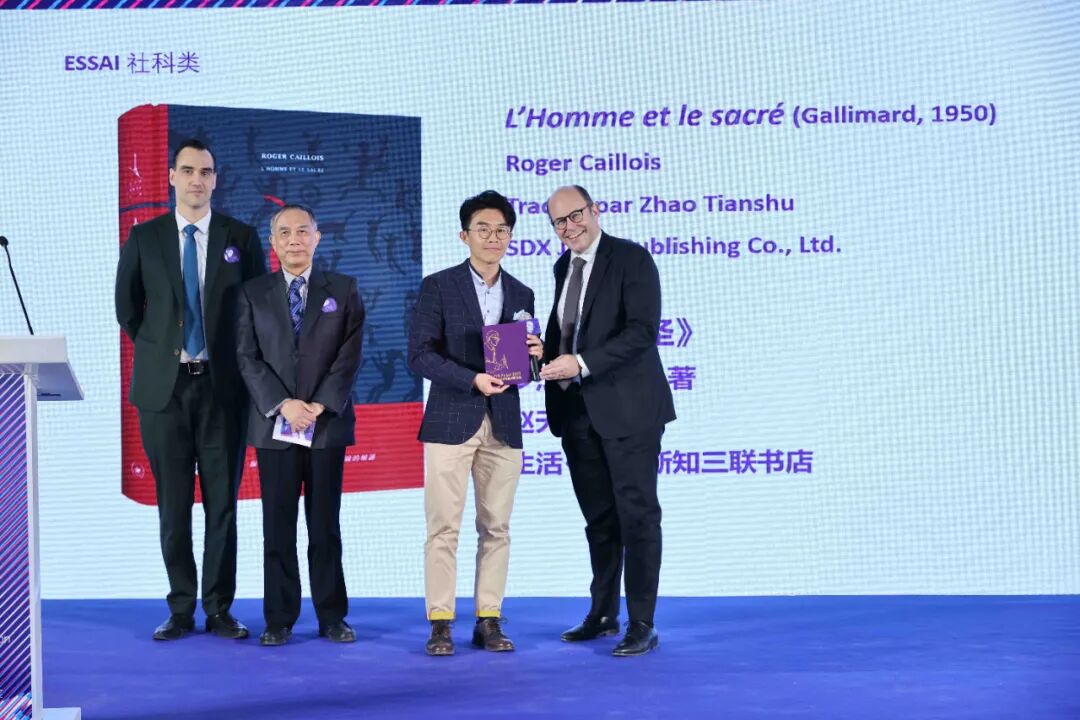 從左到右:傅雷獎(jiǎng)常任評(píng)委博杰,傅雷獎(jiǎng)常任評(píng)委余中先,趙天舒,法國(guó)駐華大使館文化、教育與科學(xué)事務(wù)公使銜參贊艾文鴻