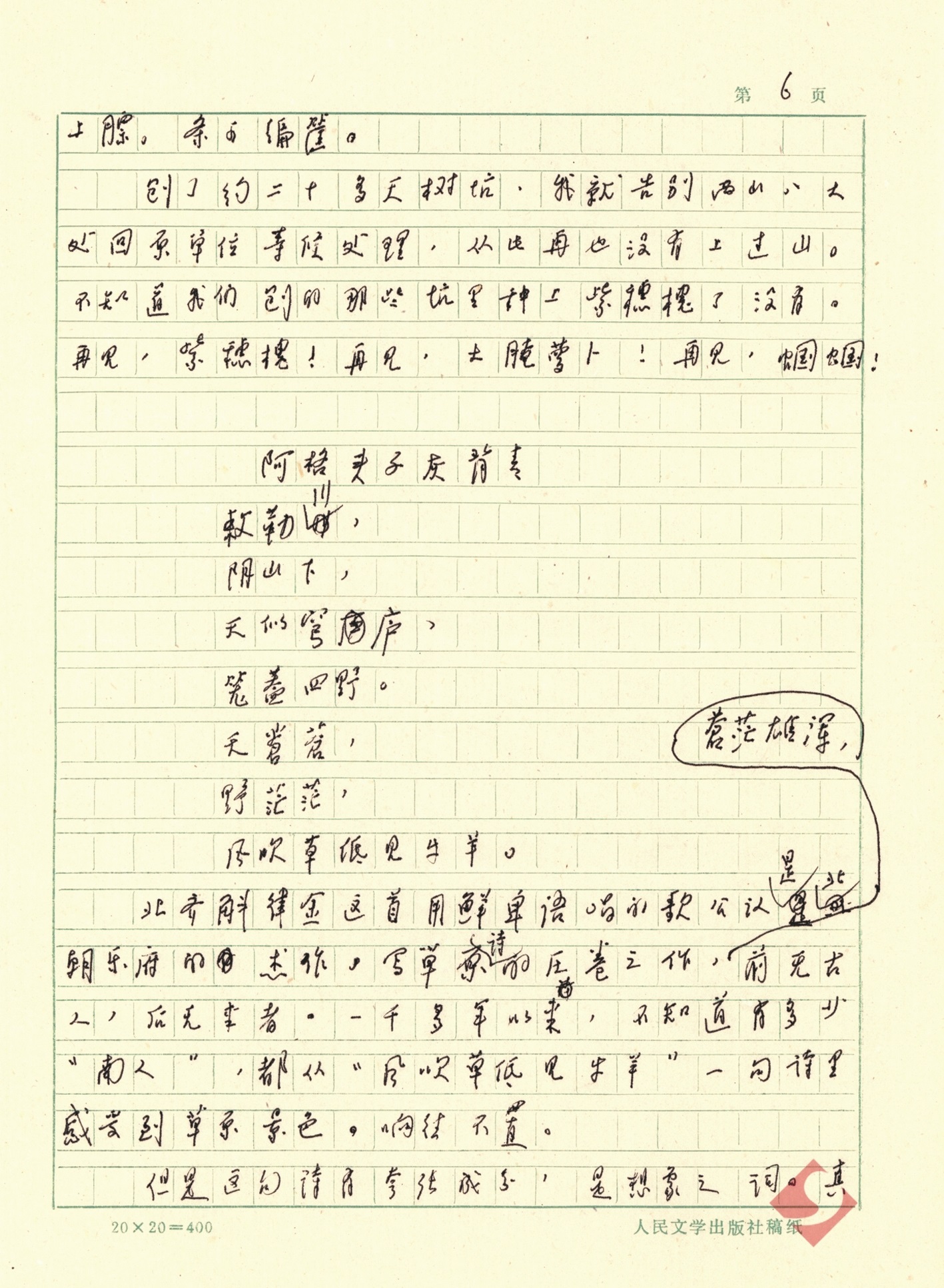 在《阿格頭子灰背青》的手稿中,他由壩上草原的牧草,聯(lián)想到了北齊名歌《敕勒歌》。原稿寫(xiě):“寫(xiě)草原詩(shī)的壓卷之作,前無(wú)古人,后無(wú)來(lái)者?!毕肓讼?,又在“壓卷之作”之后添了四字——“蒼茫雄渾”。這四個(gè)字,讓整段文字忽然有了氣象。文學(xué)史的評(píng)價(jià),忽而化作草原上的長(zhǎng)風(fēng)浩蕩?!吧n茫雄渾”,概括了《敕勒歌》的風(fēng)格,也投射出汪曾祺本人的精神向往。想象一下,一個(gè)正在塞外田壟間勞作的人,心中回響的卻是“天蒼蒼,野茫?!钡那Ч沤^唱。這份跨越時(shí)空的共鳴,也許正是士人之心的底色——困頓中有天地,樸實(shí)中有氣度。