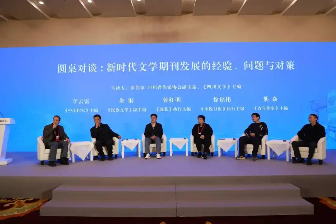 在由《四川文學(xué)》主編羅偉章主持的圓桌討論中,《中國作家》主編李云雷、《民族文學(xué)》副主編朱鋼、《收獲》執(zhí)行主編鐘紅明、《小說月報》執(zhí)行主編徐福偉、《青年作家》主編熊焱,就“新時代文學(xué)期刊發(fā)展的經(jīng)驗、問題與對策”展開深入對話。與會嘉賓結(jié)合辦刊實踐,分析當前文學(xué)期刊發(fā)展中的難點與機遇,總結(jié)創(chuàng)新經(jīng)驗,共同探索高質(zhì)量發(fā)展路徑。其中李云雷在討論中特別提及新大眾文藝、素人寫作等前沿議題。