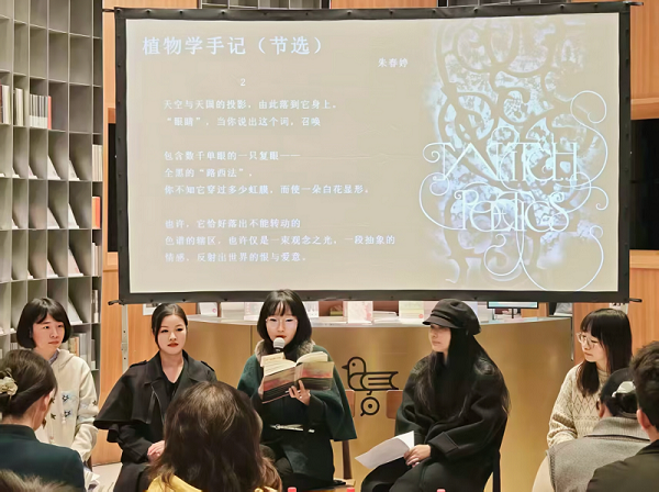 作為這部詩選的主編,朱春婷特別強(qiáng)調(diào)了“城市漫游者”團(tuán)體在創(chuàng)作過程中,對(duì)語言與靈性的關(guān)注。她認(rèn)為,和歐洲中世紀(jì)城市化進(jìn)程而出現(xiàn)的巫之傳統(tǒng)不同,中國傳統(tǒng)文化中的巫覡文化重視用祝禱的方式,來打通天、地、人之間的壁壘。語言在創(chuàng)世之初的混沌中,命名和分別了事物,這一過程是伴隨“創(chuàng)造性”的行動(dòng)發(fā)生的,是海德格爾所說的“存在之家”。而詩歌對(duì)語言實(shí)驗(yàn)和既定思維的挑戰(zhàn),使得詩人需要不斷掙脫語言和想象力的邊界,像普羅米修斯盜火一樣,帶來一些出離既又規(guī)范的“詞語”和“邏輯”。它如同一場(chǎng)必然失敗的修行,但又因仿佛在無限趨近真相,而令創(chuàng)作者自覺無限榮耀和幸福。朱春婷隨后朗誦了自己的詩歌《植物學(xué)手記》,分析了其中的重要意象。