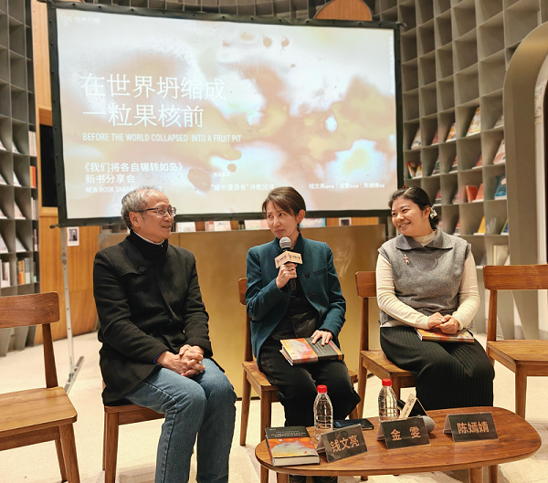 發(fā)起于上海的詩歌團(tuán)體“城市漫游者”出版了《我們將各自輾轉(zhuǎn)如島:城市漫游者詩選》(2025),中國社會(huì)科學(xué)院周瓚教授曾以“寫詩的女巫”一語形容該詩集呈現(xiàn)出的獨(dú)特面貌。日前,“城市漫游者”主要成員在思南書局·詩歌店相聚,就詩歌選集舉辦了新書分享會(huì)兼詩歌朗讀會(huì)“在世界塌縮成一粒果核前”,與華東師范大學(xué)教授金雯、書評(píng)人陳嫣婧、上海大學(xué)教授錢文亮等特邀嘉賓,以及到場(chǎng)讀者一起分享創(chuàng)作。