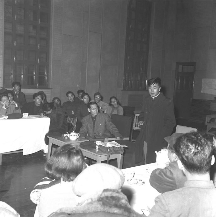 ②1958年,焦菊隱與《智取威虎山》劇組聽原著小說《林海雪原》作者曲波談創(chuàng)作