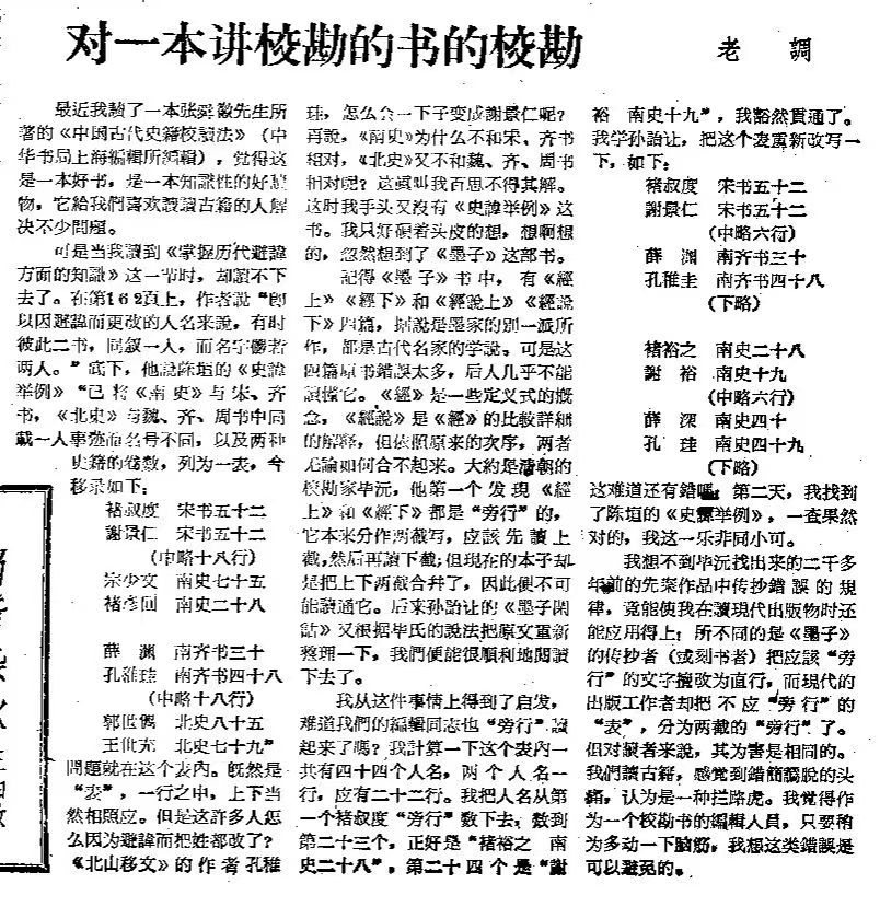 今天《文匯報》有《中國古代史籍校讀法》的批評,查此書由我擔(dān)任通讀,當(dāng)時對此表并未讀過,認(rèn)為已校過多次,一般的讀不易發(fā)現(xiàn)問題,為求急于出書,便未細(xì)讀,否則四十四人同姓不同名的上下相對,當(dāng)不難理解,卻只看到此表上排多有“宋書”,下排多有“南史”字樣,也當(dāng)作旁行。蓋因此書38頁的表,提到旁行與直行的錯誤,又有152頁的表,作者也誤作直行,(其他類似的更多)便突然加以校改,卻把上文“彼此二書,同敘一人”的一段話疏忽了,實(shí)為主因。