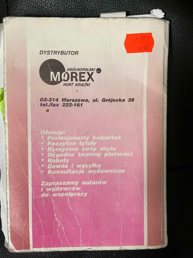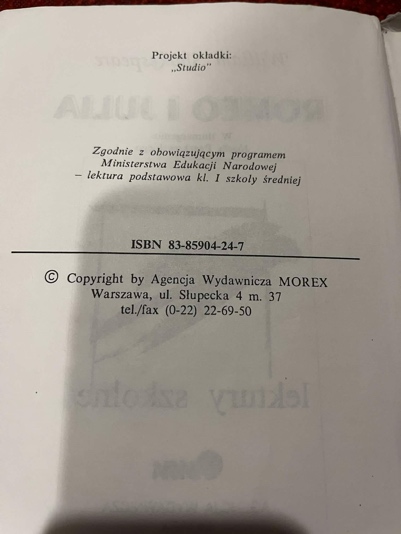 (注:舞臺(tái)上所使用劇本的封底、版權(quán)頁(yè)和封面。封底的價(jià)簽上標(biāo)記著“44000”,版權(quán)頁(yè)標(biāo)注:“根據(jù)波蘭國(guó)民教育部現(xiàn)行教學(xué)大綱——中等學(xué)校一年級(jí)的必讀文學(xué)作品”。)