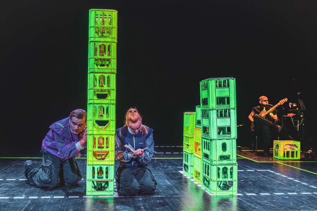 《羅密歐與朱麗葉在雞毛之地》(Romeo i Julia w krainie fakapu / Romeo and Juliet in the land of fxxx-up)的故事發(fā)生在2137年的波蘭,彼時(shí)該國(guó)已經(jīng)被Blibla和Stonka這兩家巨型連鎖超市瓜分完畢,年輕的戀人托梅克與卡西亞身處無(wú)盡的工作中,他們從垃圾堆里發(fā)現(xiàn)的上世紀(jì)90年代老舊的《羅密歐與朱麗葉》印本中尋求慰藉,在超市的貨架間扮演羅密歐與朱麗葉、發(fā)現(xiàn)愛(ài)情并拋棄自己的“姓名”與“生命”。觀(guān)眾入場(chǎng)后,首先看見(jiàn)的是一位身著黑裝、戴著墨鏡的人翹著腳坐在舞臺(tái)邊緣,不停地在手上的小本子上寫(xiě)寫(xiě)畫(huà)畫(huà)。他的黑衣上印著“Ochrona”,是波蘭語(yǔ)里“保安”的意思,身旁放著吉他、面前擺著筆記本電腦。他每隔一會(huì)就會(huì)環(huán)顧四周,然后煩躁地點(diǎn)擊筆記本電腦鍵盤(pán),播放一段機(jī)械音頻,中文字幕隨之打在電子屏幕上:“親愛(ài)的朋友們,請(qǐng)注意:我們Stonka折扣店即將迎來(lái)史上最長(zhǎng)的10分鐘休息時(shí)間!”保安是這部戲劇除“羅密歐”與“朱麗葉”外僅有的角色,出演者即該劇的導(dǎo)演之一米哈烏·拉扎爾。他在后面的表演中一邊作為超市管理層強(qiáng)權(quán)的化身進(jìn)行定期巡視,不斷給戀人施壓,持續(xù)推動(dòng)劇情的發(fā)展;一邊在舞臺(tái)邊緣控制音效并現(xiàn)場(chǎng)伴奏或伴唱。雖然入場(chǎng)的觀(guān)眾還肆無(wú)忌憚地在圓形舞臺(tái)上穿行,甚至毫不在意地與黑衣保安擦肩而過(guò),但實(shí)際上,表演早就開(kāi)始了。