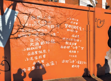 今年冬天,這條有些靜謐的小街因?yàn)橐蝗汉⒆拥脑?shī)情重?zé)ɑ盍?,只見街道披上石榴紅“外衣”,深淺不一的色塊與周邊建筑融為一體,上面的一行行詩(shī)句,引得路人忍不住駐足品讀。