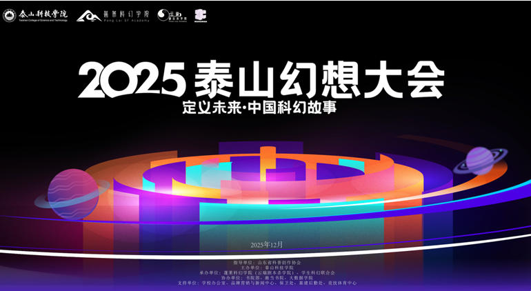 12月6日至7日,由山東省科普創(chuàng)作協(xié)會(huì)指導(dǎo),泰山科技學(xué)院主辦,蓬萊科幻學(xué)院(云端劇本殺學(xué)院)、學(xué)生科幻聯(lián)合會(huì)承辦的2025泰山幻想大會(huì)系列活動(dòng)在山東泰安泰山科技學(xué)院舉行,本次活動(dòng)的主題為“定義未來:中國科幻故事”。中國作協(xié)主席團(tuán)委員、中國作協(xié)科幻文學(xué)委員會(huì)主任劉慈欣,中國科幻銀河獎(jiǎng)、華語科幻星云獎(jiǎng)終身成就獎(jiǎng)獲得者王晉康,科普時(shí)報(bào)社社長、中國科普作家協(xié)會(huì)原副理事長尹傳紅,世界華人科幻協(xié)會(huì)主席韓松,復(fù)旦大學(xué)中文系教授、博士生導(dǎo)師嚴(yán)鋒,泰安市科協(xié)四級(jí)調(diào)研員陳金輝、科普部部長韓盛濤,泰山科技學(xué)院常務(wù)副校長謝承紅、副校長丁???、校長助理武浩然,重慶移通學(xué)院通識(shí)教育學(xué)院執(zhí)行院長皮若蘭,蓬萊科幻學(xué)院(云端劇本殺學(xué)院)副院長宋亞潔,以及楊楓、楊平、凌晨、江波、寶樹、超俠、楊晚晴、分型橙子、海漄、孫強(qiáng)、游者、袁振民、姚明、鈦藝、伯爵大人、賈天軻等科幻作家、編輯、評(píng)論家、從業(yè)者,《科幻與想象力》通識(shí)課程學(xué)生代表和齊魯科幻聯(lián)盟學(xué)子500余人參加了本次活動(dòng)。