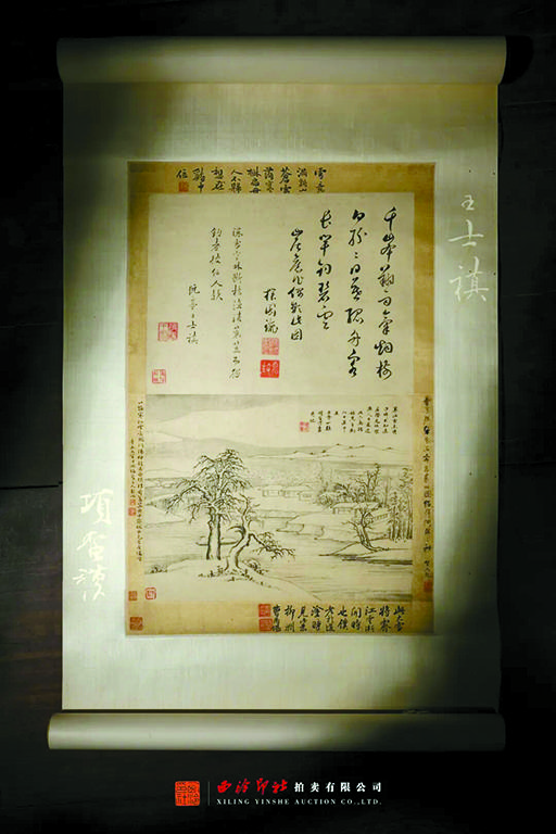 2025西泠秋拍項(xiàng)圣謨《寒江深雪圖》一幅,據(jù)“辛卯春三月寫于西子湖上”落款,知為順治八年(1651)春所作,時(shí)項(xiàng)圣謨五十五歲。圖有曹爾堪、周廷鑨、吳嘉紀(jì)、吳山、王士禛題跋。王漁洋題:“深雪寒林,斷橋漁浦,蓑笠而獨(dú)釣者,彼何人歟?”鈐“钑鏤王家”陰陽印??吹脚馁u網(wǎng)頁的宣傳詞“最盛年的項(xiàng)圣謨,十八歲的王士禎,同賞西湖雪景”,我甚為錯(cuò)愕。十八歲的王士禛尚在鄉(xiāng)里讀書,并且終其身未踐杭城之土,何來與項(xiàng)圣謨同賞西湖雪景之事?說明中又強(qiáng)調(diào):“此跋應(yīng)是市場(chǎng)所見王士禎最年少的墨跡,跋后所鈐‘钑鏤王家’朱白印十分罕見,或?yàn)槠浼易逵≌??!贝税瞎鏋闈O洋十八歲所作嗎?絕無可能。