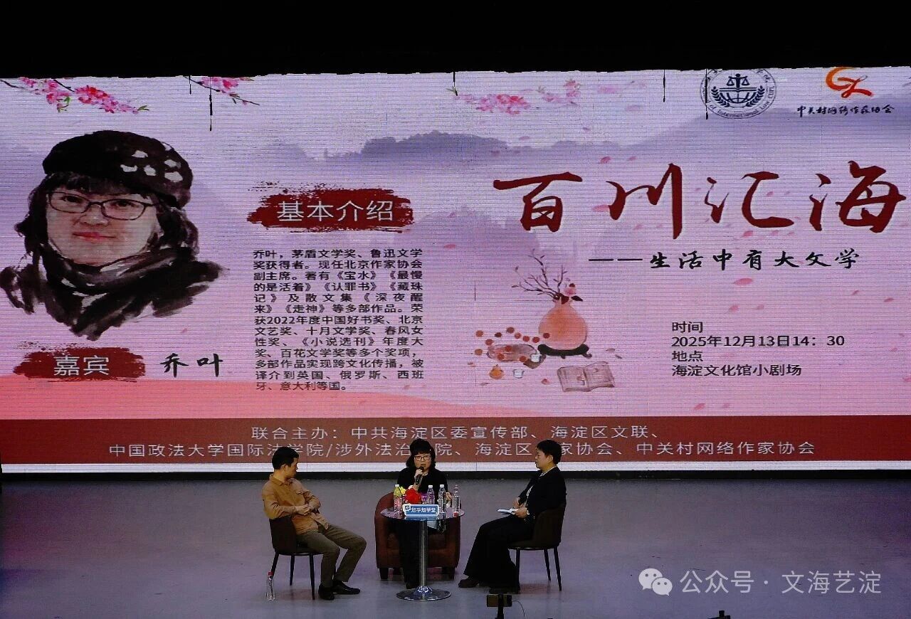 12月13日,由中共海淀區(qū)委宣傳部、海淀區(qū)文聯(lián)、中國(guó)政法大學(xué)國(guó)際法學(xué)院/涉外法治學(xué)院主辦,海淀區(qū)作家協(xié)會(huì)、中關(guān)村網(wǎng)絡(luò)作家協(xié)會(huì)承辦的“百川匯海·作家大講堂”第五期活動(dòng)在海淀黃莊文化館小劇場(chǎng)開講。作家喬葉以“生活中有大文學(xué)”為主題,與中國(guó)社會(huì)科學(xué)院文學(xué)所研究員、中國(guó)當(dāng)代文學(xué)研究會(huì)常務(wù)副秘書長(zhǎng)徐剛,中國(guó)作協(xié)會(huì)員、中國(guó)報(bào)告文學(xué)學(xué)會(huì)理事仇秀莉展開深度對(duì)話,為現(xiàn)場(chǎng)200余位觀眾呈現(xiàn)了一場(chǎng)兼具思想深度與生活溫度的文學(xué)盛宴,活動(dòng)由張順宇主持。